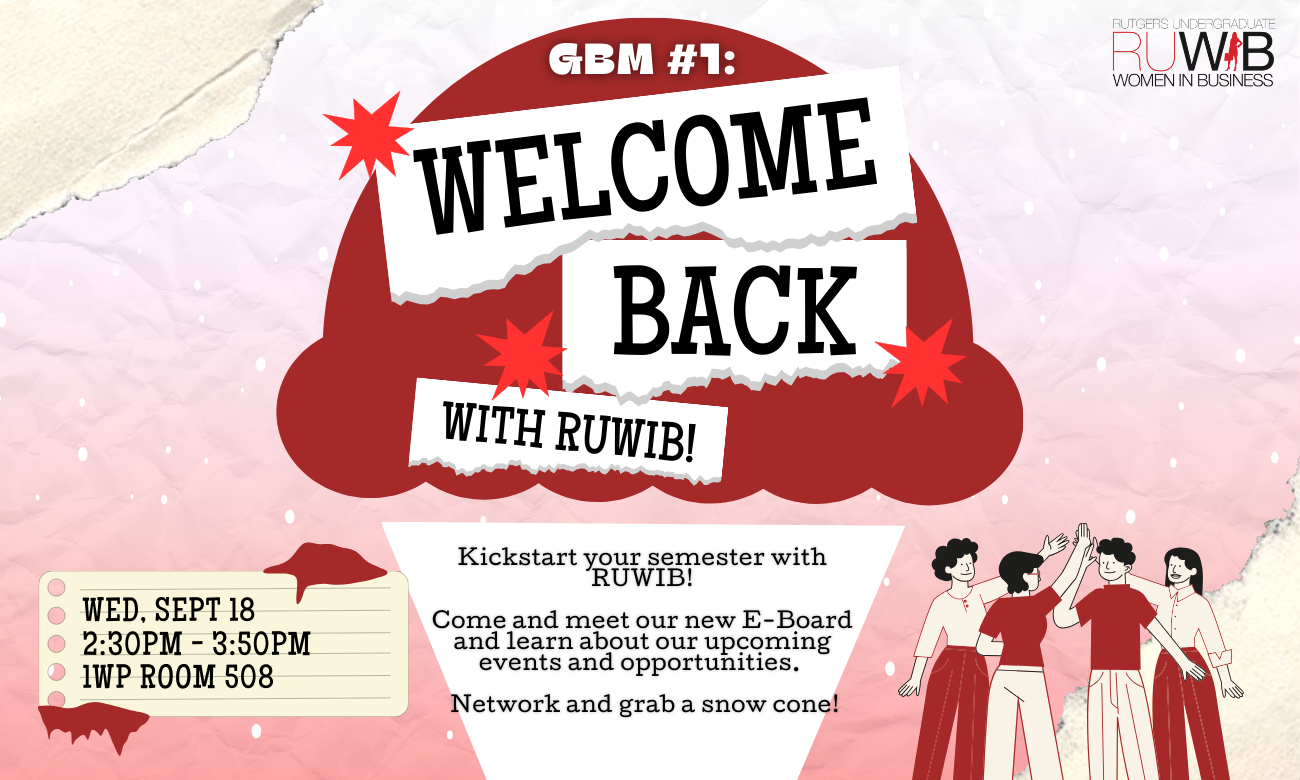 Back to All Events GBM #1: Welcome Back with RUWIB! Wednesday, September 18, 2024 2:30 PM 3:50 PM Google Calendar ICS